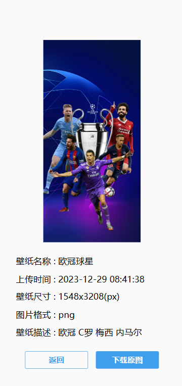 这是详情页面,展示该壁纸的各种信息。点击下面的“下载原图”按钮可以下载原图。点击底下的返回按钮返回上一级。