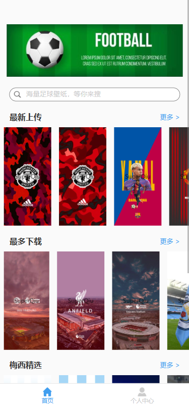 这是APP的首页,有最新上传的壁纸和下载量最多壁纸的前六名。还有梅西与C罗最受欢迎壁纸前六名。点击更多可进入列表页,查看所有壁纸。点击最上面的搜索栏可进入搜索页面。点击某张壁纸可进去详情页面。