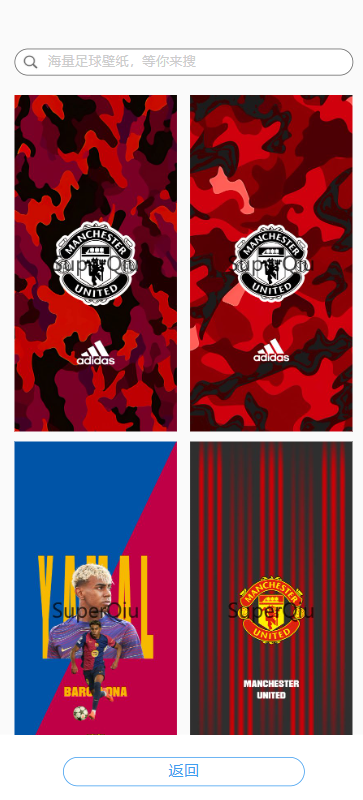 这是列表页,默认展示所有壁纸,若有搜索关键词,则展示与搜索关键词相关的所有壁纸。点击某一张,可进入详情页面。点击上面的搜索可以进去搜索页面。点击底下的返回按钮返回上一级。
