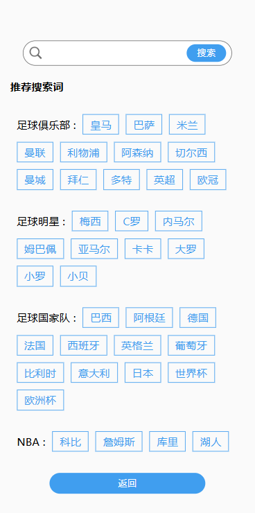 这是搜索页面,最上面的搜索框,用户可以自行输入。下面有提供热门的搜索词,点击后可进行该词的快捷搜索。点击底下的返回按钮返回上一级。